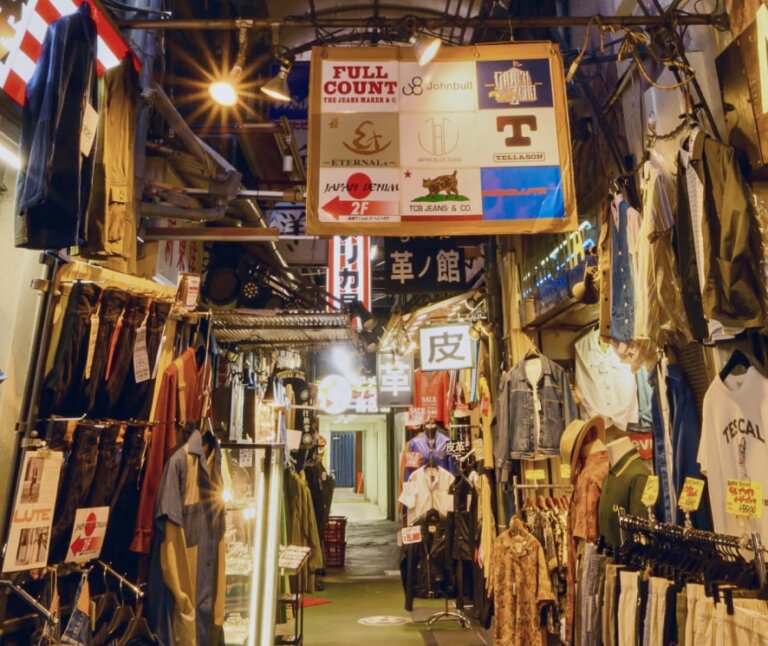 上野・アメ横といえば、東京でも有数のアメカジの聖地。古着だけでなく新品のアメリカブランドやミリタリー、ワーク系のアイテムまで幅広く揃い、昔から変わらない熱気に包まれています。デニムやレザージャケットなど定番の男らしいアイテムを探すのにもぴったりで、大人がじっくり買い物を楽しめるエリアです。