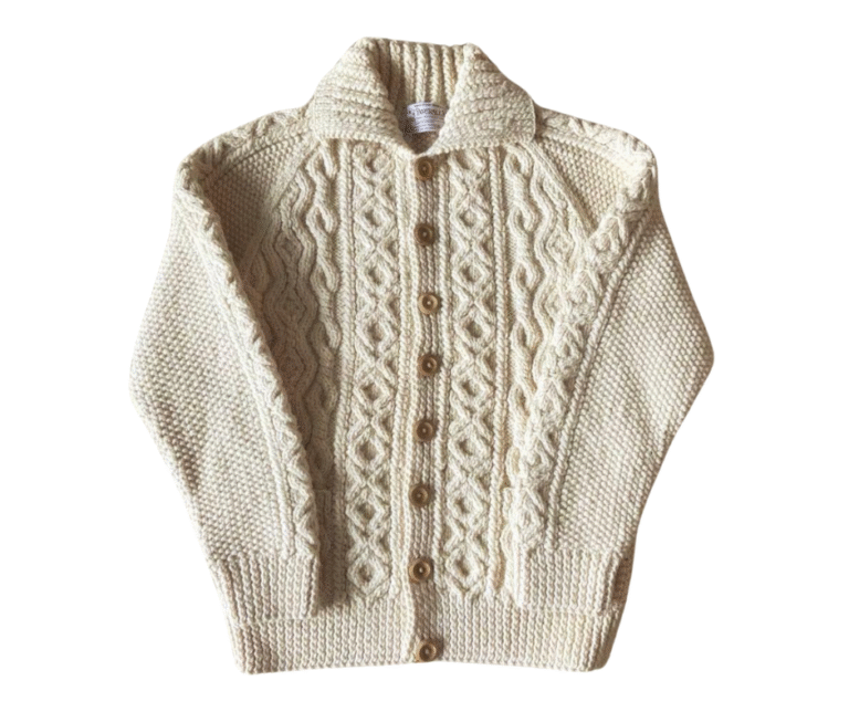 インバーアランの象徴ともいえる王道モデル。フロントボタンとショールカラーが特徴で、厚みのある編み地が生み出す重厚感が魅力です。アウターとしても活躍し、手編みならではの立体的な編み柄が存在感を放ちます。クラシックなアランニットの雰囲気を最も感じられるモデルです。